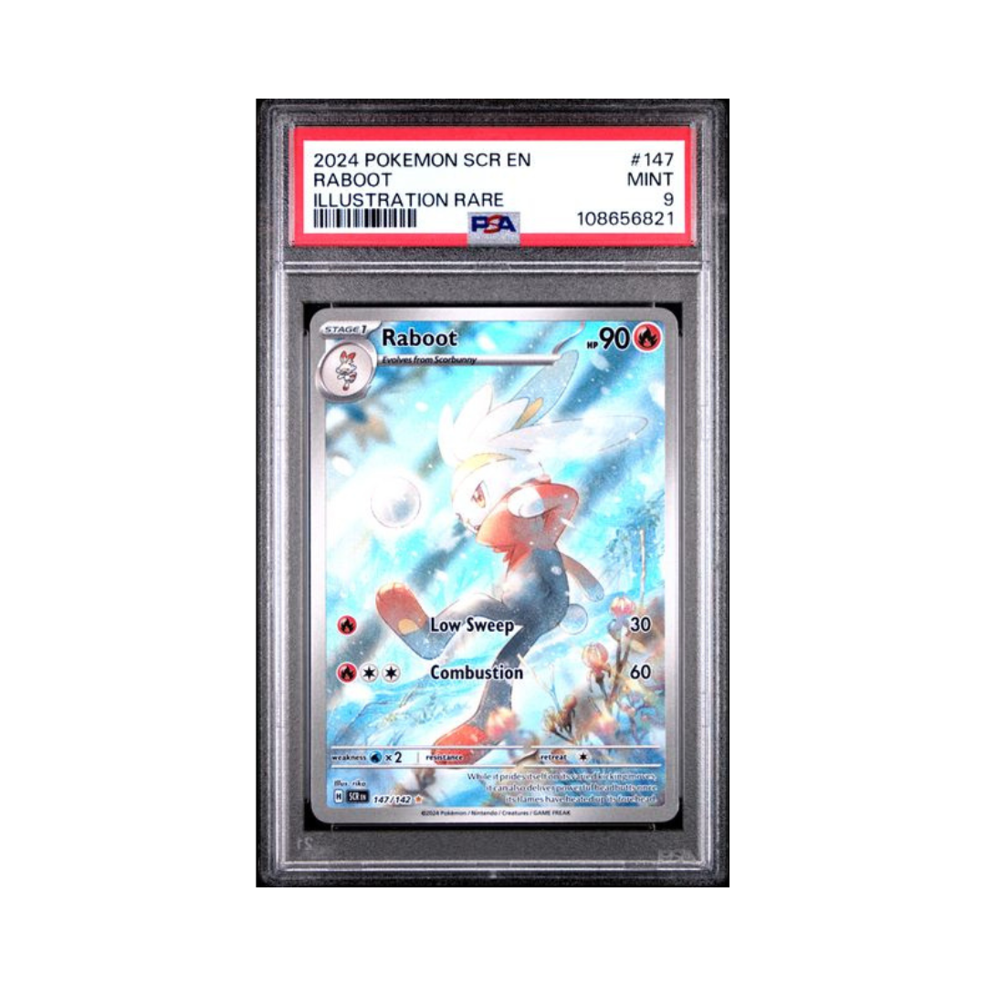 2024 Pokémon SCR EN Raboot #147 PSA 9 yra oficiali kolekcinė Pokémon Trading Card Game (TCG) korta iš 2024 m. Scarlet & Violet: Stellar Crown rinkinio, kuri profesionaliai įvertinta Professional Sports Authenticator (PSA) ir gauta 9 (Mint) būklės įvertinimą. Ši korta priklauso Illustration Rare / Secret Rare (SCR) kategorijai, todėl vizualiai yra išsiskirianti ir kolekcininkų vertinama dėl unikalios grafikos ir riboto pasiekiamumo.