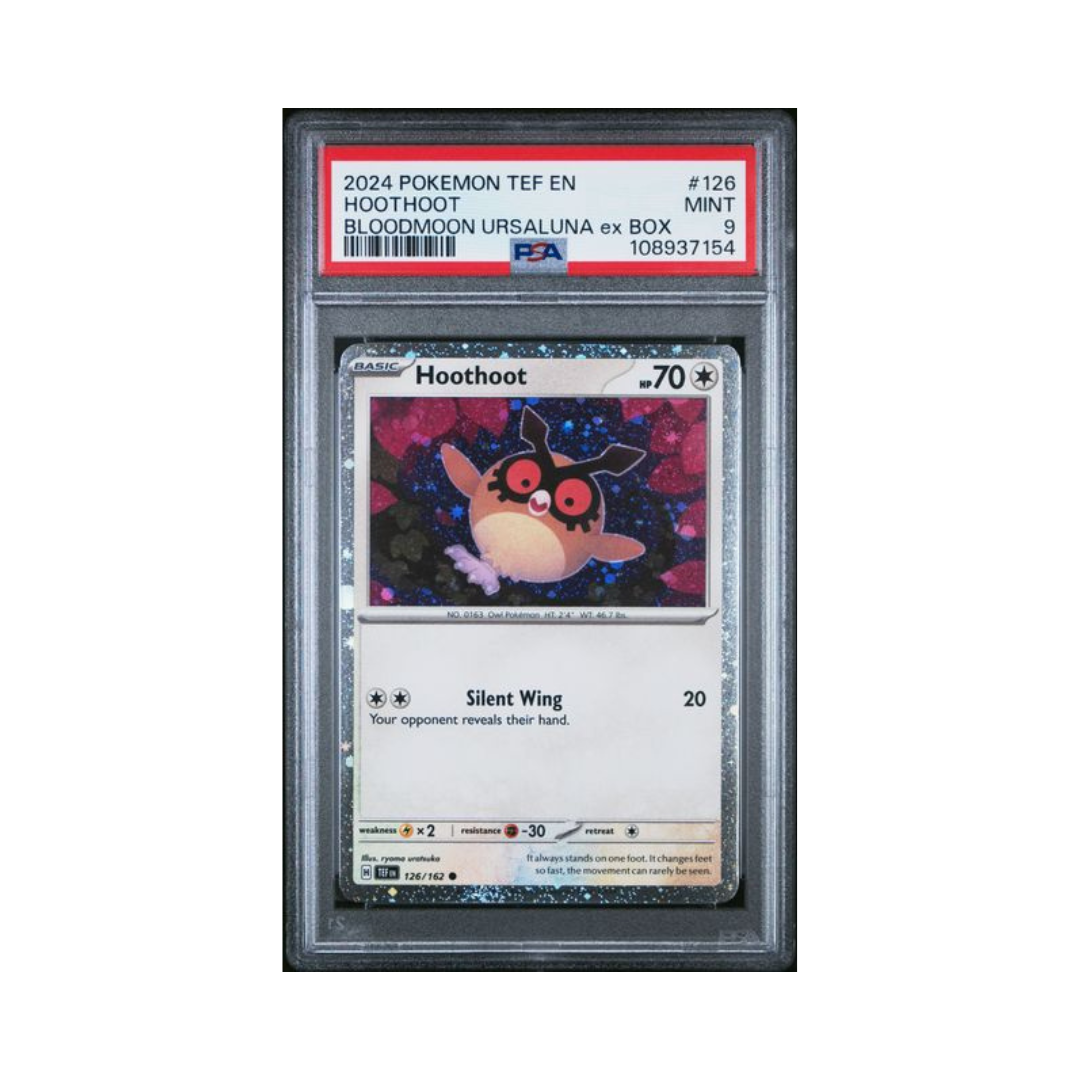 2024 Pokémon TEF EN Hoothoot PSA 9 yra oficiali Pokémon Trading Card Game (TCG) kolekcinė korta iš 2024 m. Temporal Forces (TEF) rinkinio (kortos numeris #126), kuri yra anglų kalbos (EN) leidimas ir profesionaliai įvertinta PSA 9 (Mint) kategorijoje, reiškiančioje, kad korta yra labai geros būklės su minimaliais matomais defektais. Šios TEF serijos Hoothoot versijos yra žaidžiamos kaip bazinis, dažnai surenkamas Pokémonas ir nors ji nėra didelės retumo kategorijos korta, PSA 9 įvertinimas suteikia patikimą kokybės ir autentiškumo patvirtinimą