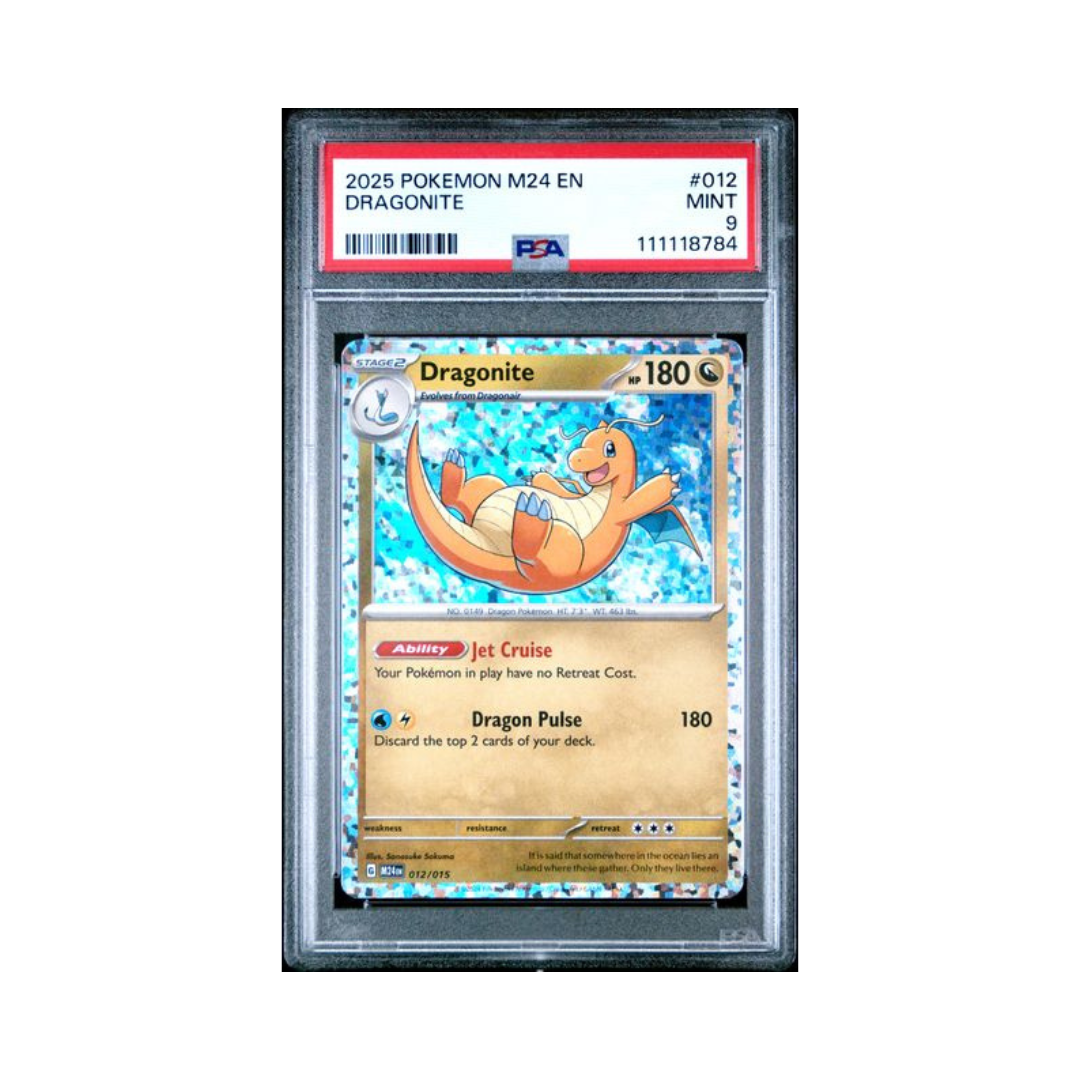 2025 Pokémon M24 EN Dragonite #012 PSA 9 yra oficiali Pokémon Trading Card Game (TCG) kolekcinė korta iš 2025-ųjų McDonald’s M24 Collection rinkinio, įvertinta Professional Sports Authenticator (PSA) institucijos. Kortos numeris rinkinyje yra #012, o veikėjas – legendinis Dragonite, vienas iš populiariausių ir visame pasaulyje atpažįstamų Pokémonų.